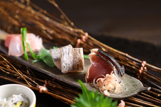 お造りはカツオ、タチウオの炙り、クロマグロ、イサキ、器の中には釜揚げシラスをご用意しております。それぞれのお造りにあう三種類の付けダレをご用意しております。