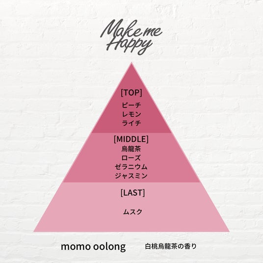 TOP:ピーチ、レモン、ライチ MIDDLE:烏龍茶、ローズ、ゼラニウム、ジャスミン LAST:ムスク