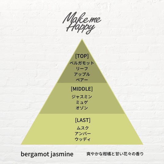 TOP:ベルガモット、リーフ、アップル、ペアー MIDDLE: ジャスミン、ミュゲ、オゾン LAST:ムスク、アンバー、ウッディ