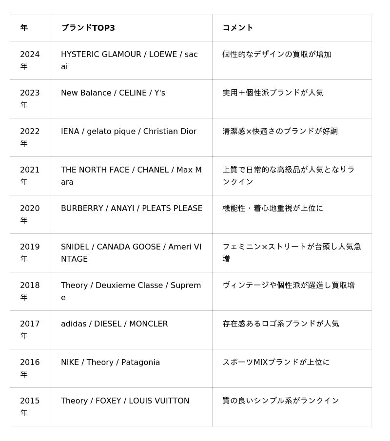 特設ページにて、フクウロの買取点数および買取点数増加率をもとに算出した「フクウロ買取ブランド年表」を公開し、買取点数が増えたブランドTOP3の変遷をたどっています。流行は「シンプル」から「ロゴ映え」「快適さ」を経て、現在は「個性重視」へと移行しており、近年は「sacai」や「HYSTERIC GLAMOUR」を筆頭に、個性的なデザインのアイテムが増加しております。