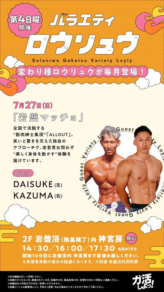 株式会社スマイルアカデミー(福岡県福岡市)の運営する「筋肉紳士集団ALLOUT」が、7月27日(日)に、関西最大級の温泉の温泉型テーマパーク「空庭温泉 OSAKA BAY TOWER 」(大阪府大阪市港区弁天1丁目2−3)にて、バラエティロウリュウ「岩盤マッチョ」を実施致します。