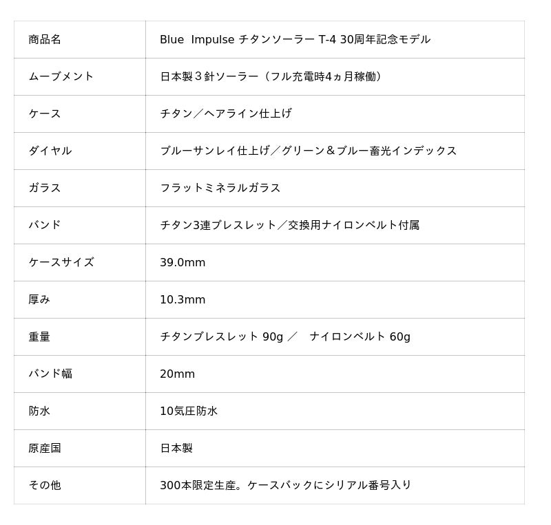 T-4機体にも採用される軽量チタンと日本製ソーラーモジュールを搭載。公式30周年ロゴや“逆さの5”インデックスなど、ブルーインパルスの誇りを随所に込めた特別仕様。
