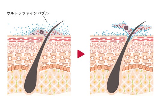 ウルトラファインバブルが角質や毛穴の汚れをきれいに除去ウルトラファインバブルは1μm未満の気泡。毛穴の汚れや角栓を浮かせてすっきりと洗い流し、次に使うスキンケアの浸透をサポートします。