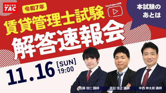 TAC株式会社(東京都千代田区、代表取締役:多田敏男)は11/16(日)19:00~YouTubeライブで賃貸不動産経営管理士試験解答速報会を開催!予想正答・難易度等を徹底解説します!
