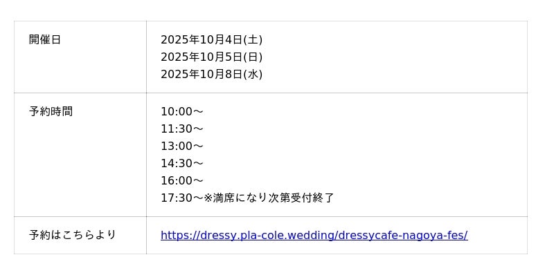 「PLACOLE & DRESSY」ブランドを展開する、冒険社プラコレ(本社:神奈川県鎌倉市、代表取締役CEO:武藤功樹)は、名古屋駅直結商業施設KITTE名古屋3F、ウェディングのテーマパークカフェ”DRESSY CAFE”にて、10/4(土)5(日)8(水)の3日間限定で、これから結婚式をお考えのカップル様に向けた、個室相談やウェディングドレス試着ができる豪華特典付きのウェディング初体験フェスを開催いたします。(40組様限定、無料開催)
