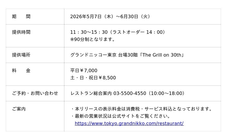 「東京を楽しむ 東京をくつろぐ」ひとときをお届けするグランドニッコー東京 台場(住所:東京都港区 総支配人:塚田 忠保)は、ホテル最上階から東京湾の美しい景色を望む「The Grill on 30th」にて、2026年5月7日(木)~6月30日(火)の期間、ジューシーなメロンを堪能できるデザートブッフェ付きの『初夏のプリフィックスランチ』を提供します。