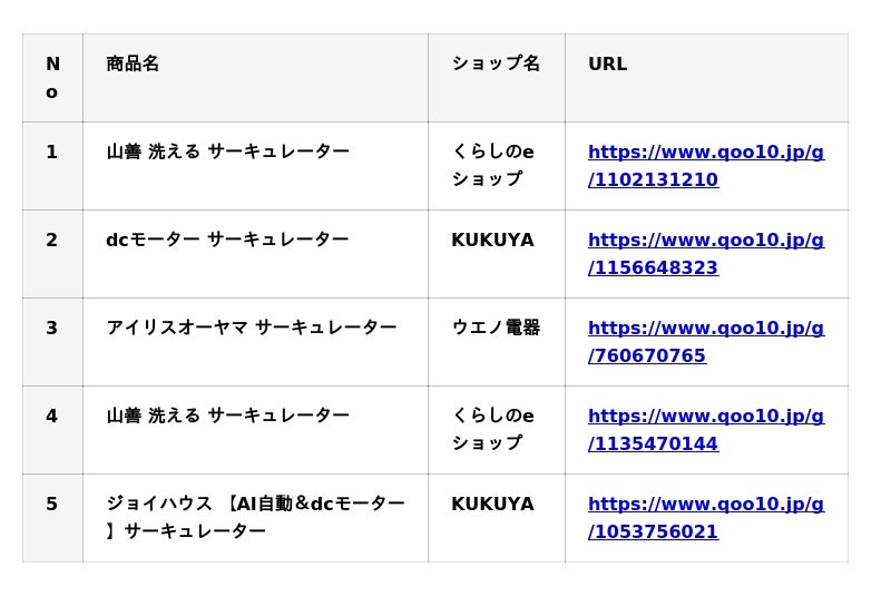 Qoo10(https://www.qoo10.jp/)サイト上、「サーキュレーター」カテゴリーの販売個数に基づいたランキングです。