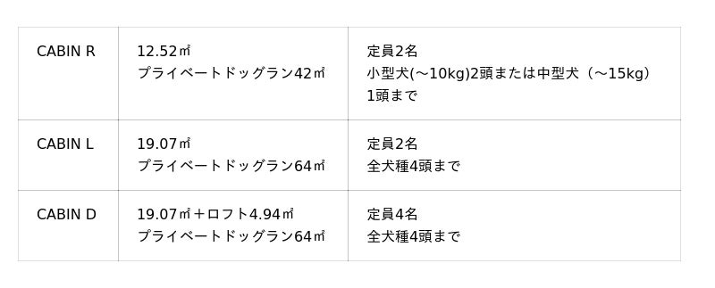 全9棟の宿泊棟を用意しています。全客室に専用のプライベートドッグランを備え、家族だけの自由な時間を過ごせます。客室は3タイプを展開し、利用人数や滞在スタイルに合わせて選ぶことが可能です。
