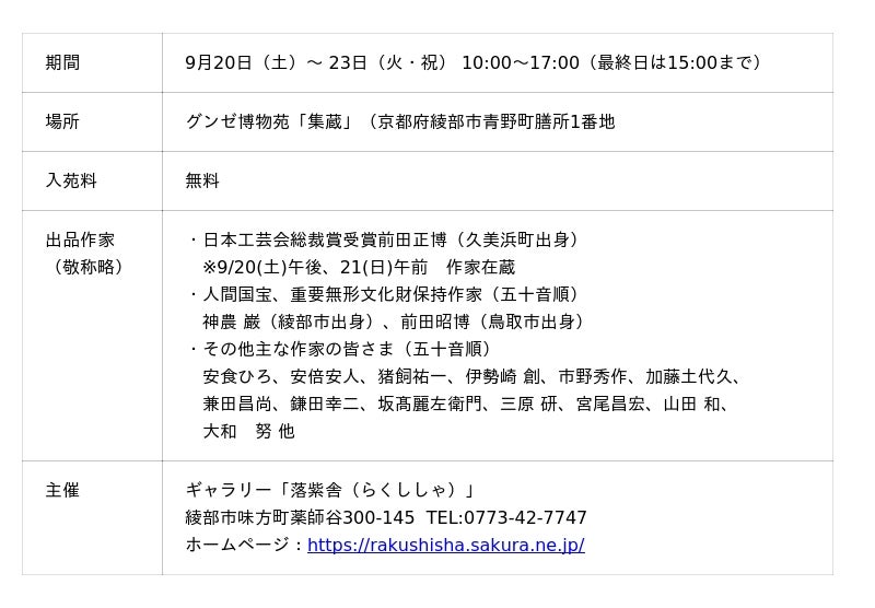主催 綾部市ギャラリー「落紫舎」、9/20(土)から9/23(火・祝)まで