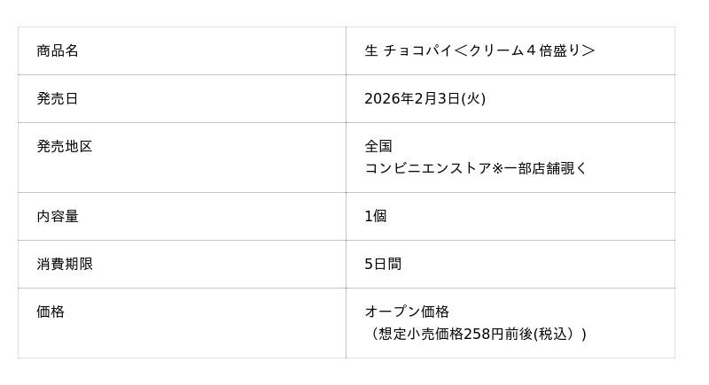 ロングセラーブランド「チョコパイ」がチルドデザートとなった「生 チョコパイ」シリーズから、ふわふわ食感、超たっぷりクリーム(※1)を楽しめる「生 チョコパイ<4倍盛り>」を全国のコンビエンスストア限定で発売します。通常の生 チョコパイと比較し、クリーム量・チョコレート量を20%アップ(※2)し、さらに大満足な一品に仕立てました。たっぷりクリームの生 チョコパイの絶妙な味わいをぜひお楽しみください。