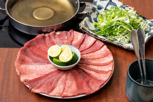 薄切りの上質な牛タンを、香り高いお出汁でさっとしゃぶしゃぶし、九条葱とスダチ、特製ポン酢でさっぱりと味わう一品です。独自の横スライス技法により、タン先からタン元まで全ての部位を1枚で楽しめるのが特徴。