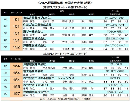 豊後プロパンは、過去の実績からも上位進出が期待されていたチームで、事前から9ホール短縮を見据えて集中したプレーを展開したことが優勝につながったといえます。