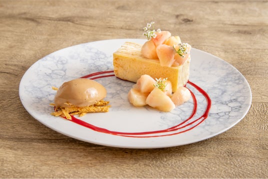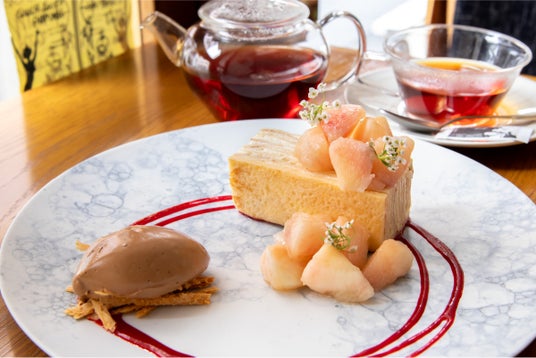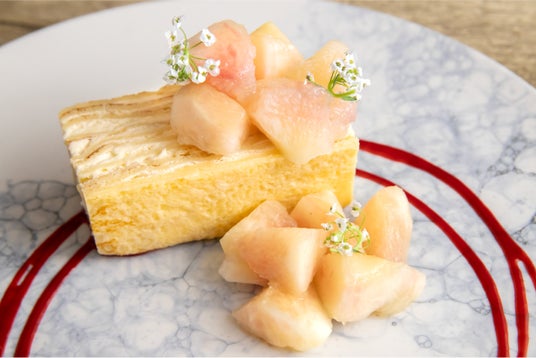 瑞々しい白桃に風味豊かなミルキッシュチーズクリームを何層にも重ね、ミルクレープ仕立てに。香り豊かな紅茶アイスを添えて。※数量限定