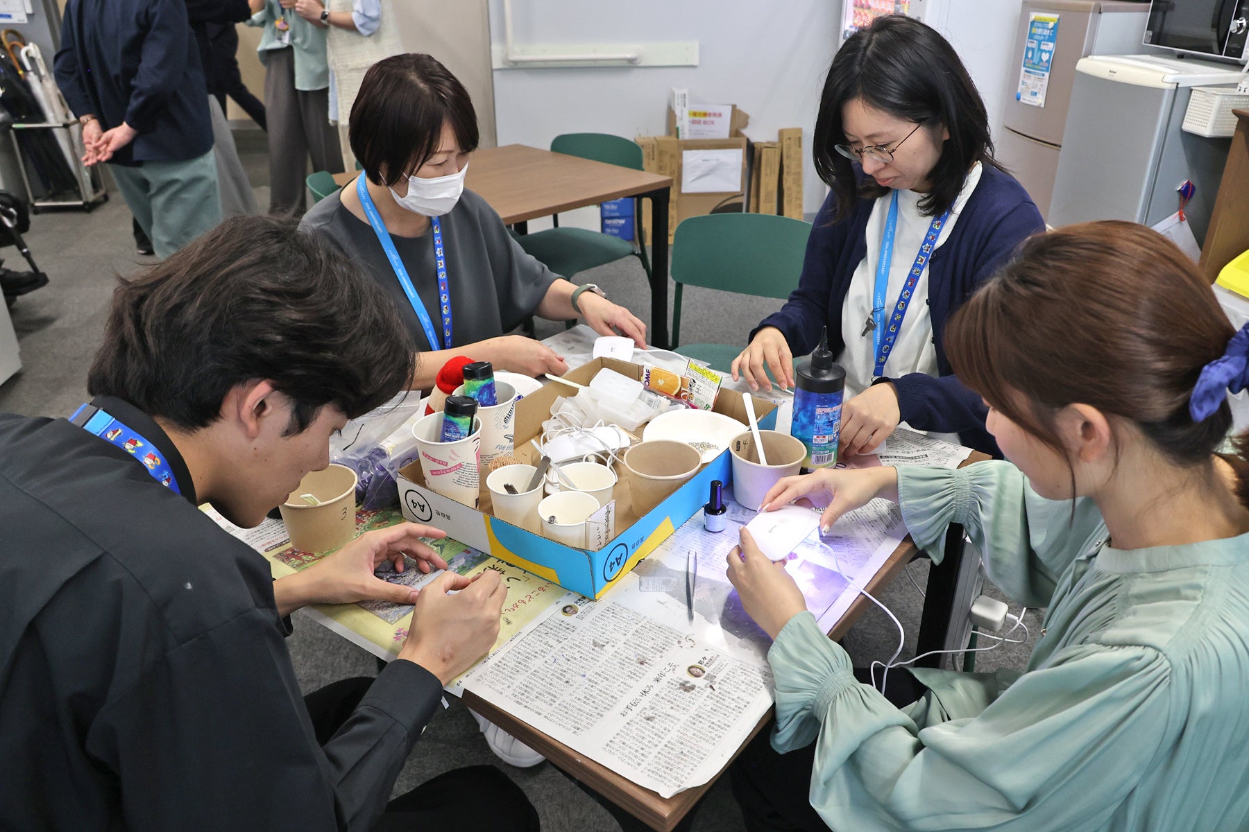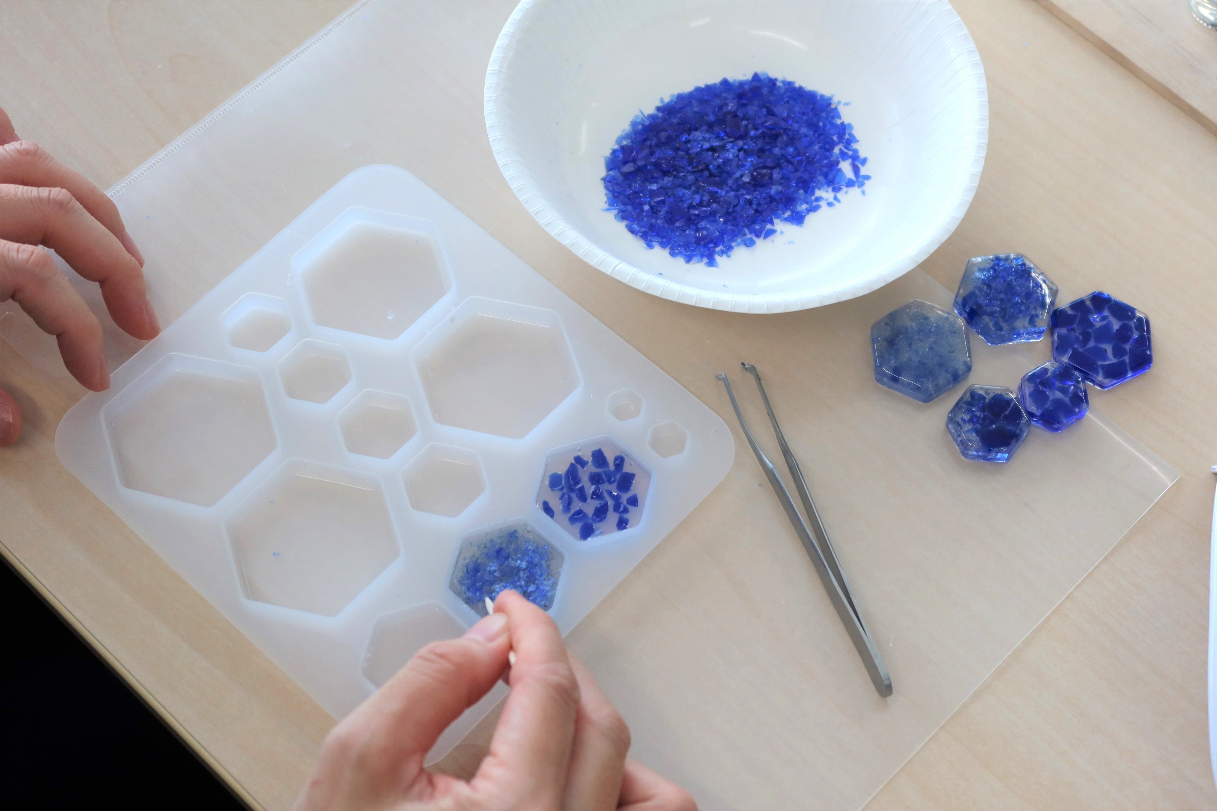 破損・交換された誘導路灯の風防をハンマーでガラス片状に細かく粉砕し、中部国際空港株式会社の社員がレジンとUVライトを用いて「テドライト(TEDLite)」を製作しています。