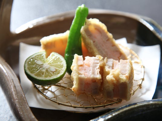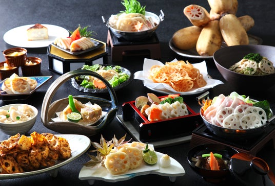 ・会席コース内:蓮根きんぴら、蓮根饅頭きのこ餡掛け、蓮根のすだち酢漬け