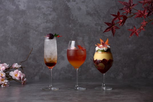 秋の夜長を彩るパフェとカクテルは、小原の四季桜をテーマに考案いたしました。小原の四季桜は、愛知県豊田市の小原地区で見られる、春と秋の年に二度花を咲かせる珍しい桜として知られています。秋には紅葉と桜が同時に楽しめる幻想的な景色が広がり、国内外から多くの観光客が訪れる地域の魅力のひとつとなっています。その「秋に咲く紅葉と桜」の風情を、見た目にも華やかな「夜な夜なパフェ~葡萄と芋の誘惑」とカクテル「秋桜 -あきざくら-」、ノンアルコールカクテル「月夜のカシス」で表現しました。