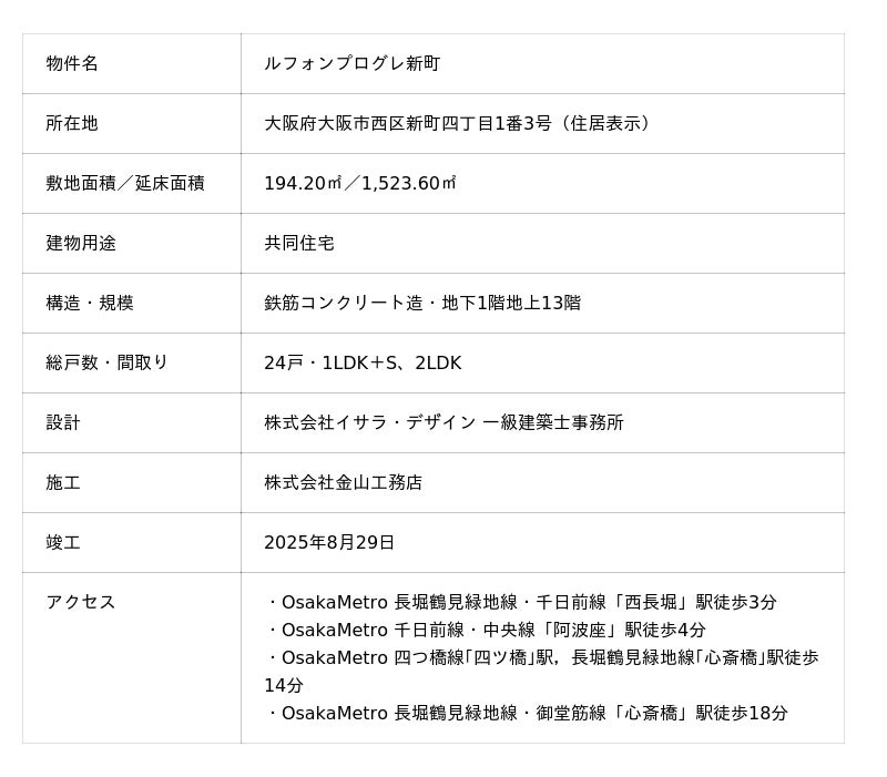 ルフォンプログレ新町(大阪府大阪市西区新町四丁目1番3号/住宅24戸、以下「本物件」という)は、都心部の利便性と落ち着いた住環境が調和した人気のエリアに位置しています。駅からのアクセスも良好で、心斎橋や梅田といった主要エリアへもスムーズに移動できる交通利便性の高い立地です。周辺にはお洒落なカフェやレストラン、日常の買い物に便利なスーパーや商業施設、緑豊かな靱公園なども点在し、都心部にいながらも心地よい暮らしを叶える住環境が広がっています。安心感のある街並みと、利便性・快適性・自然環境のバランスが取れたロケーションで理想的な住環境を提供いたします。