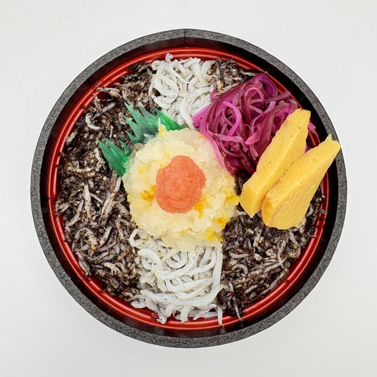 大丸でしか味わえない「福岡有明のりだれ」と「東北寒流のりだれ」それぞれのソースで和えたしらす、中央に釜揚げしらすを配置し、アクセントに柚子おろしと博多明太子をのせた、日本の北と南の海苔を同時に味わえる限定の食べ比べしらす丼です。