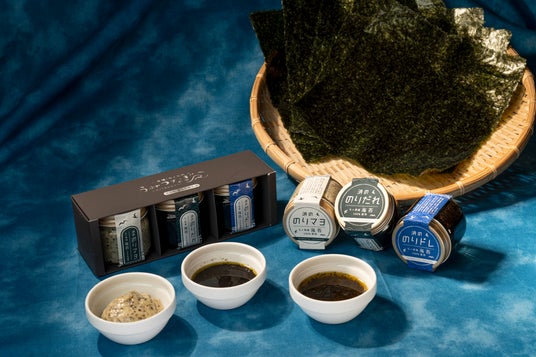 七ヶ浜産高級海苔を、こめ油、だししょうゆ、小松菜でまとめ、にんにくと唐辛子をアクセントに、海苔本来の味わいを楽しむことができる「浜ののりだれ」、浜ののりだれをマヨネーズにアレンジした「浜ののりマヨ」、ワインビネガーで爽やかな風味を添えた「浜ののりドレ」の3種を販売します(各種70ml税込745円)。