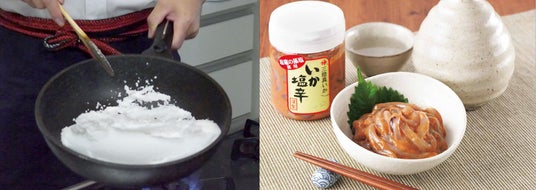平塚商店の代表商品「いかの塩辛」は、希少な“三陸産の真いか”、海藻の旨味が凝縮された高品質の“塩竈の藻塩”、 さらに太陽と自然の風と時間がつくる「天日塩」もブレンドして作られています。