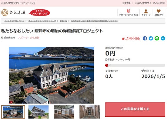 佐賀県唐津市とふるさと納税ポータルサイト「さとふる」を運営する株式会社さとふる(本社:東京都中央区、代表取締役社長 兼 CEO:藤井 宏明)は、「さとふるクラウドファンディング」にて、「私たちなおしたい!唐津市の明治の洋館修復プロジェクト」の寄付受け付けを2025年9月1日より開始します。
