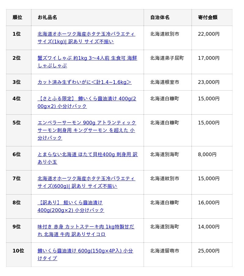 ふるさと納税ポータルサイト「さとふる」を運営する株式会社さとふる(本社:東京都中央区、代表取締役社長 兼 CEO:藤井 宏明)は、「さとふる」における<北海道版>2025年人気お礼品ランキング(確定)(※1)を発表します。