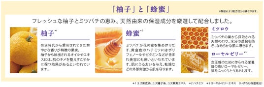 保湿成分:ユズ果皮油、ユズ種子油、ハチミツ、ローヤルゼリーエキス、ヒマワリ種子油、ホホバ種子油、コメヌカ油、カミツレ花エキス