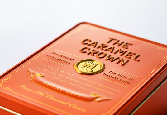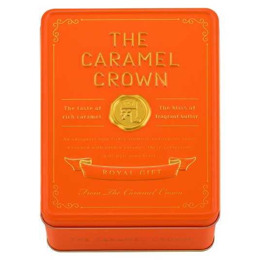 デザインテーマは「キャラメル王室からの贈り物」。封蝋印をイメージしたゴールドのロゴマークは、美味しいキャラメルスイーツの証です。何度でも贅沢なひとときを感じていただきたくて、見た目も手触りにもこだわったエンボス加工仕上げ。お菓子を食べ終わった後は、小物を保管したり、シンプルに飾っても絵になります。もちろん、再びお菓子入れとして活用しても◎。
