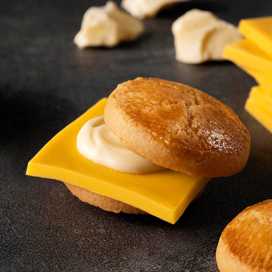 大胆にとろりとはみでるショコラが目を引く『チーズチョコレートバーガー』。チーズパウダーを練りこんだサクサク食感のバンズクッキーに、チェダーチーズとホワイトショコラをブレンドしたミルキーなチーズショコラをはみだしサンド!さらにホイップショコラをトッピングし、塩味と甘味の絶妙なバランスに仕上げました。後引く美味しさのスイーツバーガーをぜひお試しください!