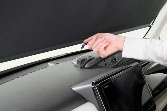 フロントシート上部の空間を活用した大型のコンソールは、すぐ取り出したい小物などを手の届くところに収納することができます。コンソール下部には、コンソール内に設置したティッシュボックスからティッシュを取り出せるスリットもついています。内蔵のサンシェードはノブを片手でつまんで引き出し、ダッシュボード上のホルダーに掛けることで簡単に展開できます。2代目N-BOX、N-BOX Custom用に2色をご用意しました。