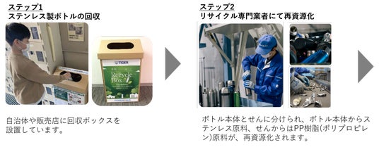ご家庭で不要になったステンレス製ボトルを地域の学校や企業の場において回収し、リサイクル専門業者へ集約。集まったリサイクル原料から再生ステンレス材および再生PP(ポリプロピレン)樹脂製品を生産します。