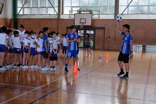 モンテディオ山形の選手と一緒に、児童がサッカー体験やボールを使ったゲームを行い、飲水タイムを実践。運動中の適切な飲水タイミングなどを実際にレクチャーいただきました。