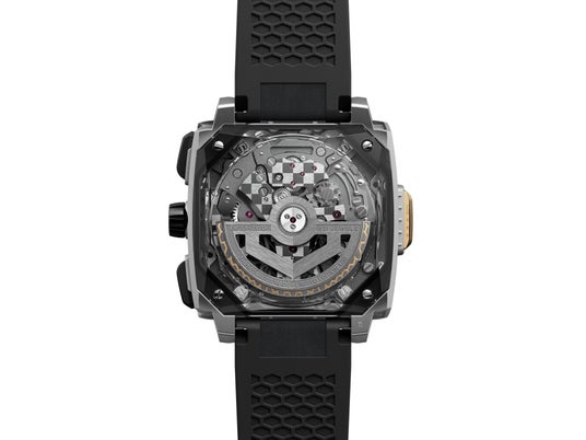 こうしたパーツが組み合わされることで、複雑な外骨格のような構造が形成されます。ハイパフォーマンスカーの格子状エンジンカバーに着想を得た、メッシュ状の2層ハニカム構造がムーブメントを囲む役割を果たしています。ケース、格子、ベゼルはすべてグレード5チタン製で、ベゼル下部の格子のみソリッド2Nイエローゴールドを使用することで、ハイテク素材と貴金属が美しく融合しています。グレード5チタン製ベゼルにはブラックDLCコーティングが施されることで、精悍なコントラストを生み、この時計の存在感あるシルエットを際立たせます。