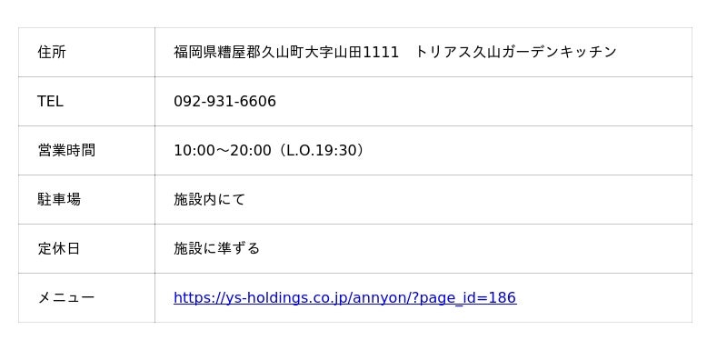 ・福岡トリアス久山店 福岡県糟屋郡久山町大字山田1111トリアス久山ガーデンキッチン 092-931-6606