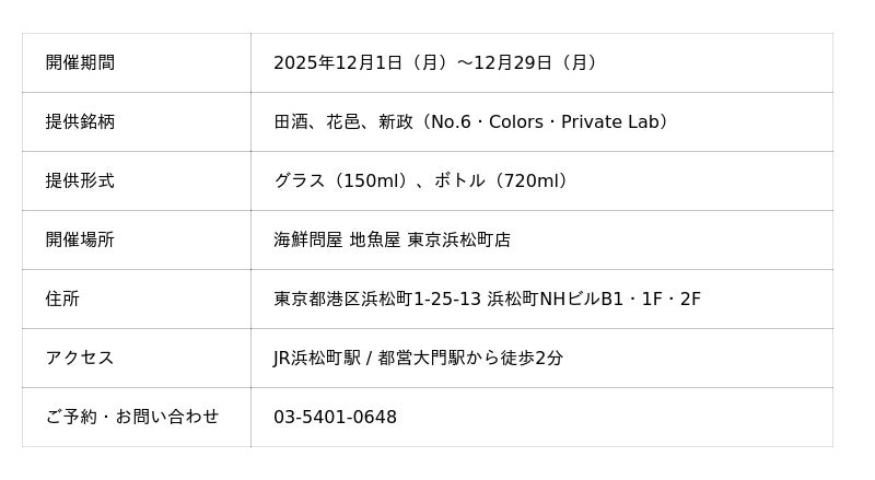 海鮮問屋 地魚屋 浜松町店(所在地:東京都港区、運営:(株)焼肉坂井ホールディングス)は、2025年12月1日(月)から12月29日(月)の期間、日本酒愛好家から圧倒的な支持を集める「田酒(でんしゅ)」「花邑(はなむら)」「新政(あらまさ)」を特別に提供する「希少酒祭り」を開催いたします。大切な会食や忘年会が増える季節に、当店の新鮮な旬の地魚と調和する、格別な日本酒との出会いをお届けいたします。
