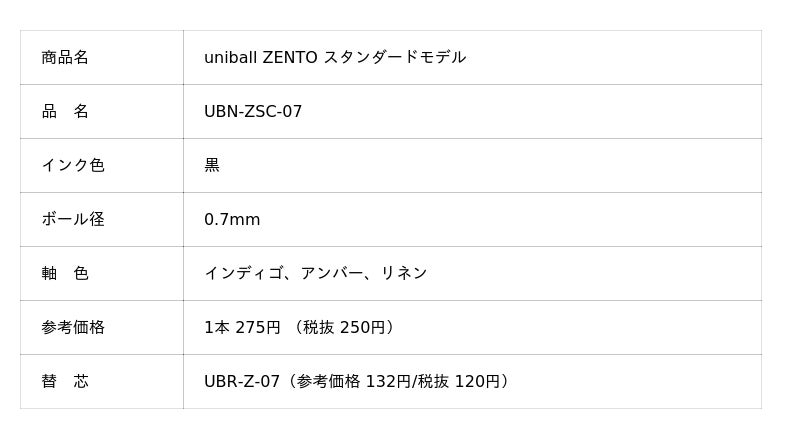 『uniball ZENTO スタンダードモデル』インディゴ、アンバー、リネン