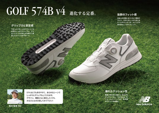 これまで長年に渡り多くのゴルファーに支持されてきた同モデルは、これまでも定評のあったゴルフ用に開発された独自のラストが提供する快適なフィット感や、ゴルフプレーに最適化されたスパイクレスアウトソールがもたらす高いトラクションはそのままに、v4はインソールの変更によりさらなるクッション性を向上させ、アッパーのデザインもより定番スニーカーの「574」のルックに近づけました。今回のアップデートを受け、さらに多くのゴルファーに高いフィット性と快適性を提供していきます。