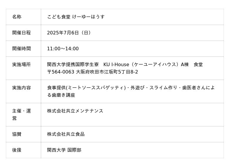 「ドーミー」の名称で全国約500棟以上の学生寮・社員寮を展開する株式会社共立メンテナンス(以下、共立メンテナンス/代表取締役社長:中村 幸治/本社:東京都千代田区)は、運営寮の関西大学(学長:高橋 智幸/場所:大阪府吹田市)の提携国際学生寮「KU I-House」にて、7月6日(日)に7回目の『こども食堂 けーゆーはうす』を開催いたします。