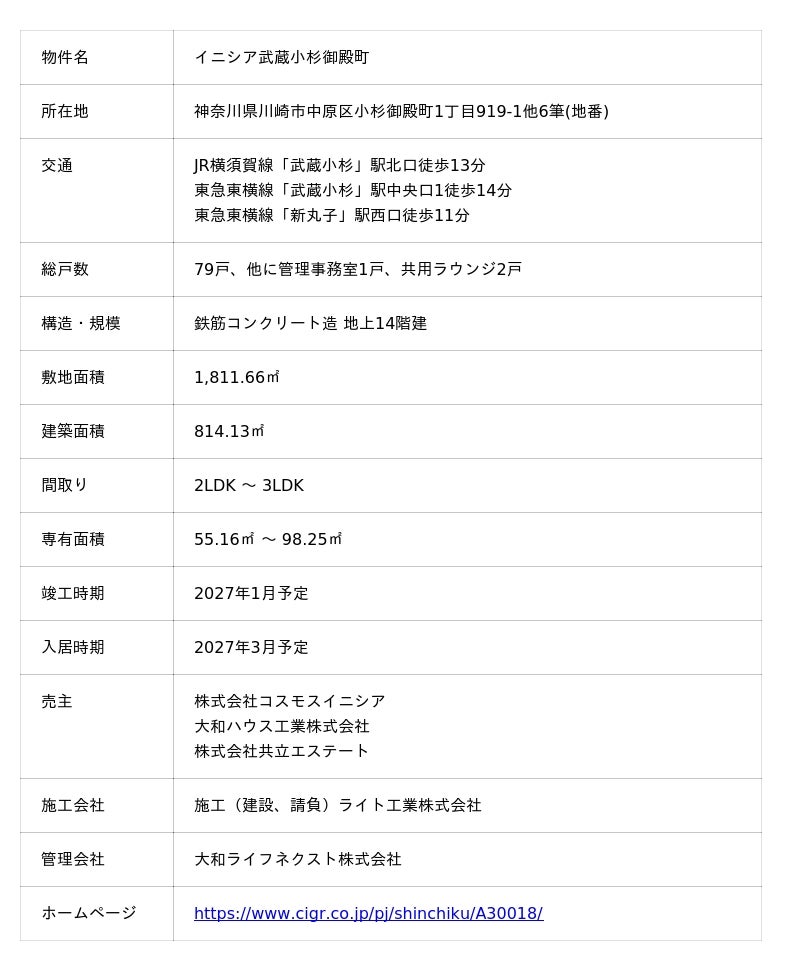 共立メンテナンスグループの株式会社共立エステート(本社:東京都文京区、代表取締役:金子 功)、大和ハウスグループの株式会社コスモスイニシア(本社:東京都港区、社長:高智 亮大朗)、大和ハウス工業株式会社(本社:大阪市、代表取締役社長:大友 浩嗣)は、3社共同で開発中の新築分譲マンション『イニシア武蔵小杉御殿町』(神奈川県川崎市、地上14階建、総戸数79戸)の第1期1次の登録販売受付を2026年1月24日(土)から開始いたしました。