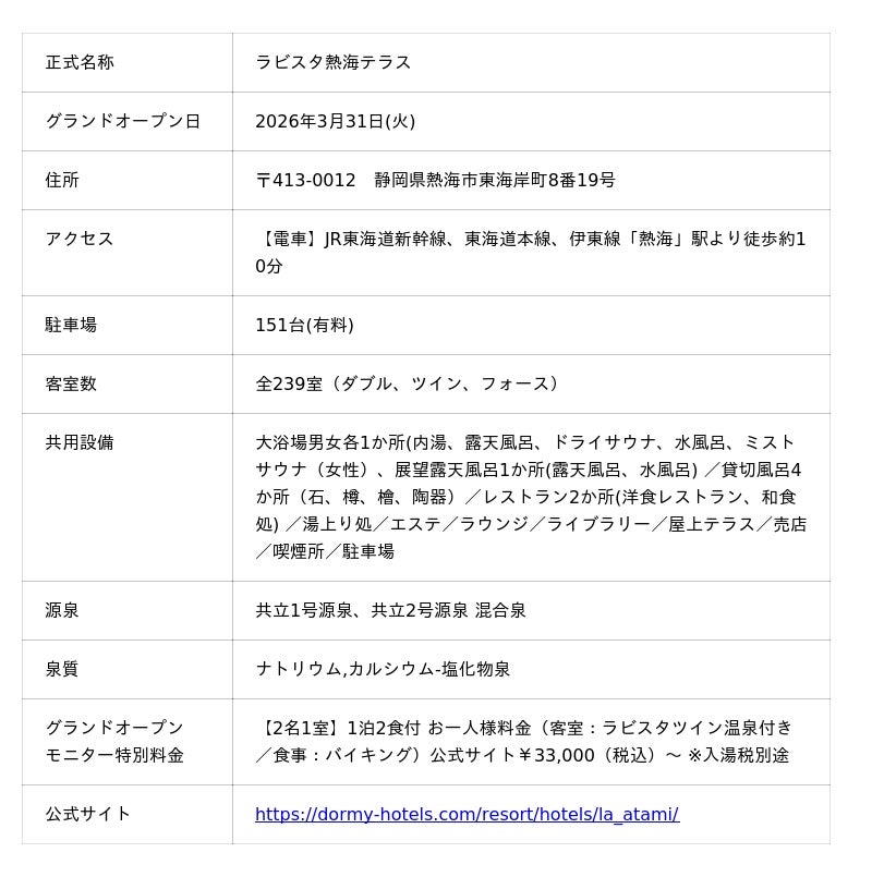 全国にリゾートホテル「共立リゾート」やビジネスホテル「ドーミーイン」を運営する株式会社共立メンテナンス(以下、共立メンテナンス/代表取締役社長:中村 幸治/本社:東京都千代田区)は、静岡県熱海市に「ラビスタシリーズ」の大型リゾートホテル『ラビスタ熱海テラス』を2026年3月31日(火)にグランドオープンいたしました。