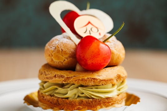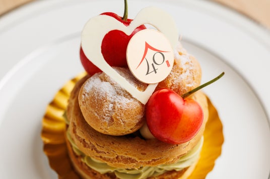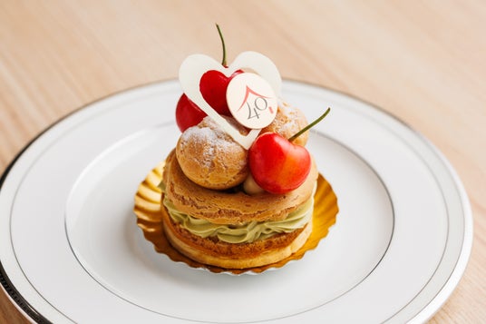 フランスの伝統菓子であるサントノーレに、大粒で美しいハート形が特徴の「ジュノハート」を3粒あしらいました。サクサクのパイ生地と軽やかなシュー生地の中には、なめらかなカスタードクリームと、香ばしいピスタチオ風味のクリームが絶妙なハーモニーを奏でます。ジュノハートの上品な甘さと酸味、そして美しいルビー色が、デザート全体を華やかに彩ります。