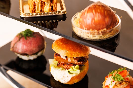 ・デザート5種、スコーン、手毬寿司、ミニ照り焼きチキンバーガー、ミニタルトのシーフードマリネ