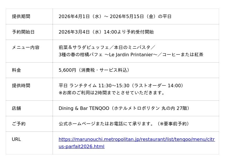 ホテルメトロポリタン 丸の内(所在地/千代田区丸の内、総支配人/桃谷健志)のダイニング&バー テンクウでは、4月1日から5月15日までの平日、3種類の春の柑橘を用いたパフェが付いたランチセットを販売いたします。日向夏をメインに、河内晩柑、湘南ゴールドの爽やかな香りが交差するパフェをお楽しみください。