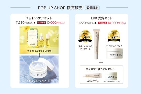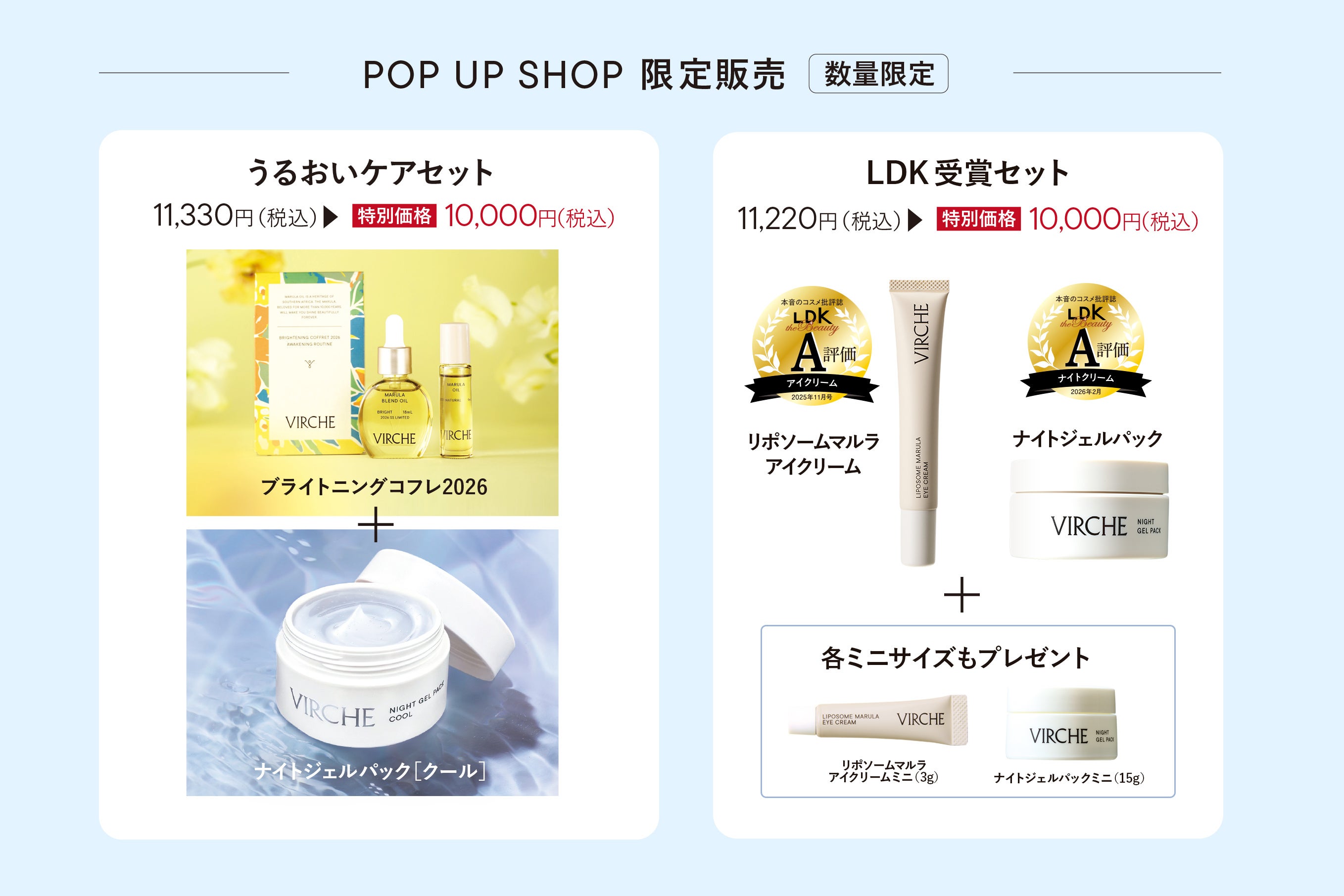 数量限定発売の「ブライトニングコフレ2026」と「ナイトジェルパック[クール]」がセットになった「うるおいケアセット」と、LDK the BeautyでA評価を受賞した「リポソームマルラアイクリーム」と「ナイトジェルパック[クール]」がセットになった「LDK受賞セット」の2種を今回のPOP UP SHOP限定で販売します。