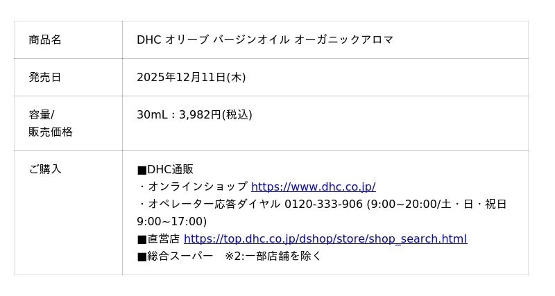 株式会社ディーエイチシー(本社:東京都港区、代表取締役社長:宮崎緑、以下:DHC)は、商品番号1番として40年以上愛され続けている看板商品「DHC オリーブ バージンオイル」から初の“アロマ仕様”商品として、「DHC オリーブ バージンオイル オーガニックアロマ」を2025年12月11日(木)より数量限定で発売いたします。