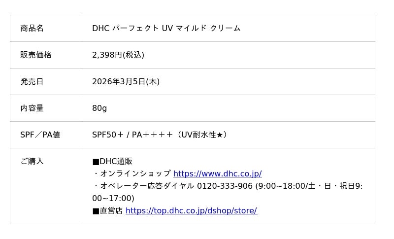 株式会社ディーエイチシー(本社:東京都港区、代表取締役社長:宮崎緑、以下:DHC)は、「DHC パーフェクト UV シリーズ」よりノンケミカル処方の「DHC パーフェクト UV マイルド クリーム」を2026年3月5日(木)に新発売いたします。肌へのやさしさと国内最高数値の紫外線カット力を両立、“やさしい”も“やけない”も諦めない、敏感肌の方でも毎日心地よく使える高機能UVケアです。