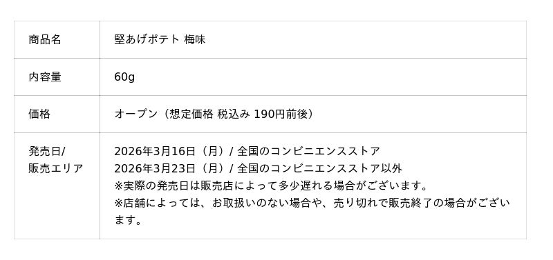 カルビー株式会社(本社:東京都千代田区、代表取締役社長兼CEO:江原 信)は、“噛むほどうまい!”堅い食感が人気のポテトチップス「堅あげポテト」より、この時期だけの特別な新商品『堅あげポテト 梅味』を2026年3月16日(月)から全国のコンビニエンスストア先行で期間限定発売します。コンビニエンスストア以外の店舗では、2026年3月23日(月)から期間限定発売します(2026年6月中旬終売予定)。
