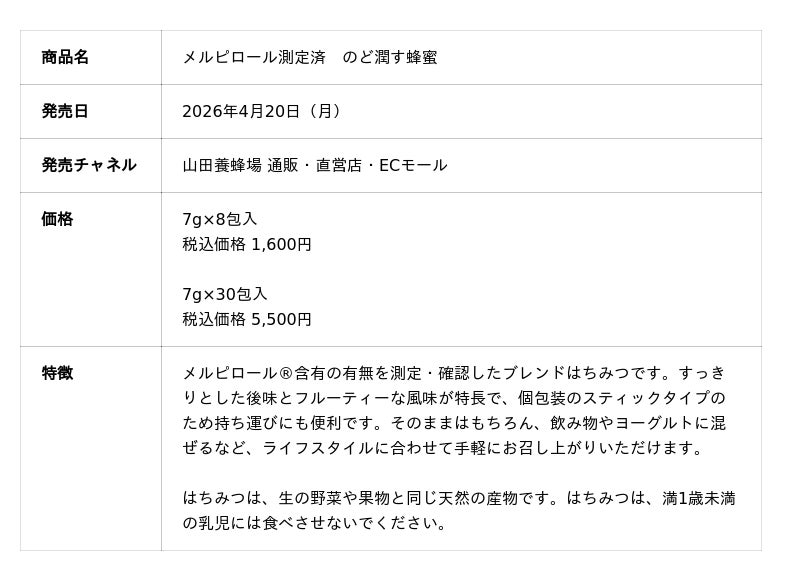株式会社山田養蜂場(本社:岡山県苫田郡鏡野町、代表:山田英生)は、10年にわたる研究の成果として、注目成分「メルピロール(R)」の含有有無を独自の測定技術により可視化・規格化した、世界初※1のはちみつ「メルピロール測定済 のど潤す蜂蜜」を、2026年4月20日より新発売いたします。