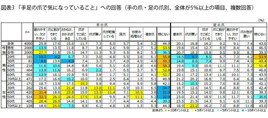 では、具体的に爪のどういったことが気になるのか、手足の爪それぞれについてたずねた結果が図表3です。手の爪のトップ3は「割れやすい、欠けやすい」20.8%、「爪に筋ができている」17.6%、「さかむけ、ささくれがある」15.6%に。「割れやすい、欠けやすい」と「さかむけ、ささくれがある」が女性の40・50代を中心に高値となっており、水仕事など家事の影響もありそうです。加齢も一因という「爪に筋ができる」は50代以上で女性では4分の1が挙げている一方で男性は10%台にとどまるように、全般に30代以上を中心に女性の方が高値となりました。そのなかで、「爪がでこぼこしている」では20代女性が19.3%と比較的高値に。爪が波打ったような状態になるのは栄養不足も影響するので、ダイエットなども一因かもしれません。一方、足の爪のトップ3は「巻き爪」20.1%、「爪が厚い」16.8%、「爪がでこぼこしている」14.2%に。「巻き爪」や「爪が厚い」は足に合わない靴も一因となるので、靴選びの工夫などで改善する可能性もありそうです。手・足ともに「特にない」とした人は4割強にのぼり、特に男性では手が70代以上以外の全世代、足も20・40代で各5割超となりました。「特にない」から逆算すると、何かしら気になることがある人は男性が手46.5%・足53.5%、女性が手63.7%・足60.5%と、男性は足、女性は手の爪で気になることが多いようです。