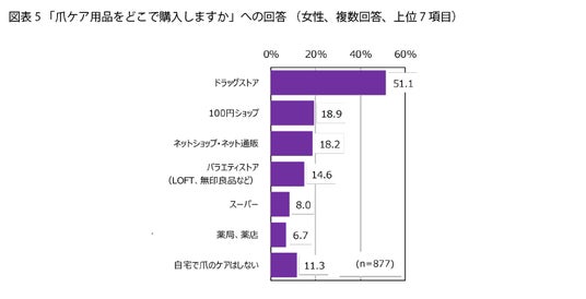 爪ケア用品の購入場所では(図表5)、51.1%が「ドラッグストア」と回答。日常的な買い物のついでや品ぞろえが背景にありそうです。2位は「100円ショップ」18.9%で、お試しも含めて安価に済ませよう、ということでしょうか。これに0.7ポイントの僅差で手軽に利用できる「ネットショップ・ネット通販」、さらに「バラエティストア」14.6%が続きました。